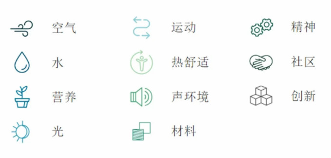 Concept:空氣Air、水Water、營養(yǎng)Nourishment、光線Light、運(yùn)動(dòng)Movement、熱舒適Thermal Comfort、聲環(huán)境Sound、材料Materials、精神Mind、社區(qū)Community、創(chuàng)新Innovations